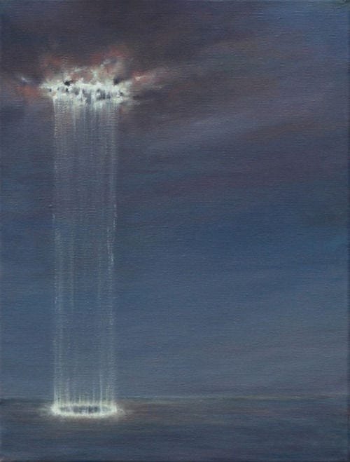The image below, titled Enlightenment, shows two extremes happening together. There is no guidance as to how we should view it. Are we witnessing a pull or a push? The painting, depicting what appears to be a waterspout, is still and moving at the same time. Lingering between the abstract and the romantic, it makes us question the relationship between what we see and what we know, as eloquently described by the art critic John Berger: